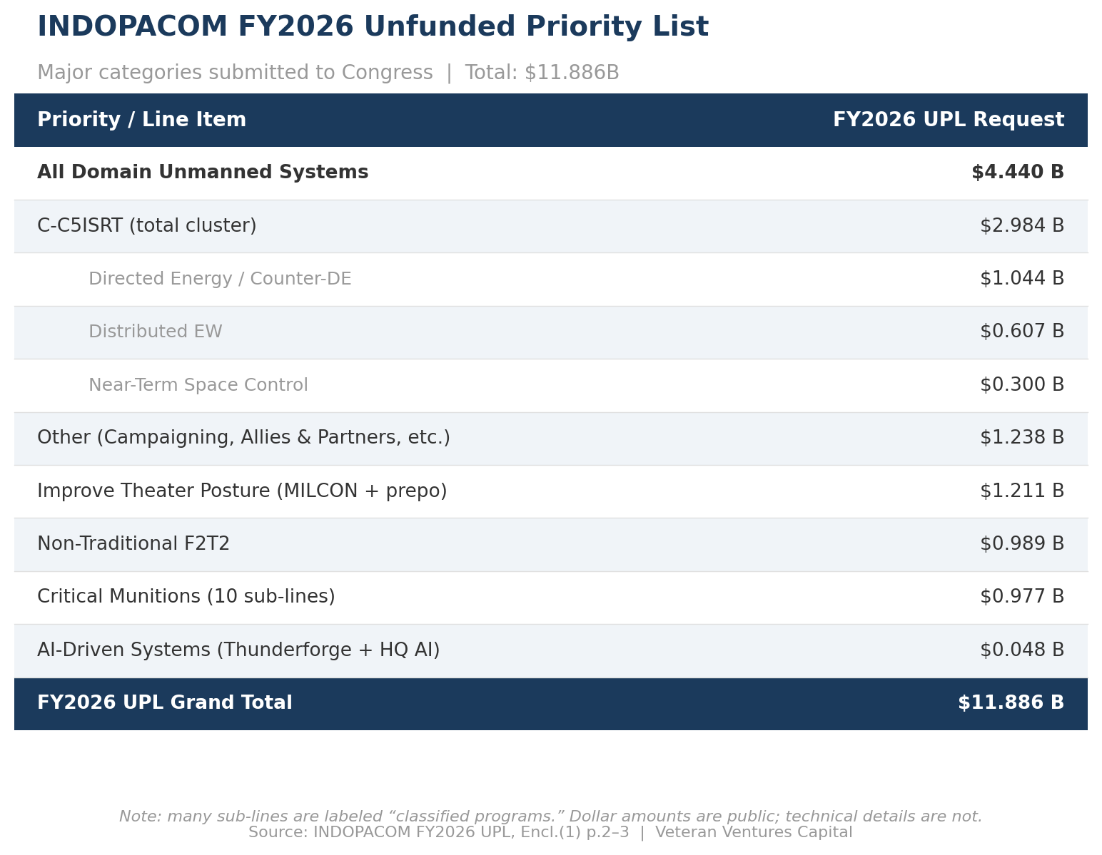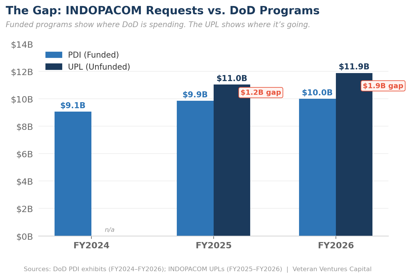 INDOPACOM's FY2026 UPL totals $11.886 billion. That sits alongside the Pacific Deterrence Initiative (PDI), the portion of the DoD budget Congress tracks as Indo-Pacific spending. The FY2026 PDI totals $10 billion, up modestly from prior years. Together, they point to roughly $22 billion in stated demand for the theater: the funded baseline and the Commander's marginal priorities combined. While not directly additive given differences in scope, methodology, and what each excludes, together the PDI and UPL provide a useful directional view of funded priorities and marginal demand across the theater.