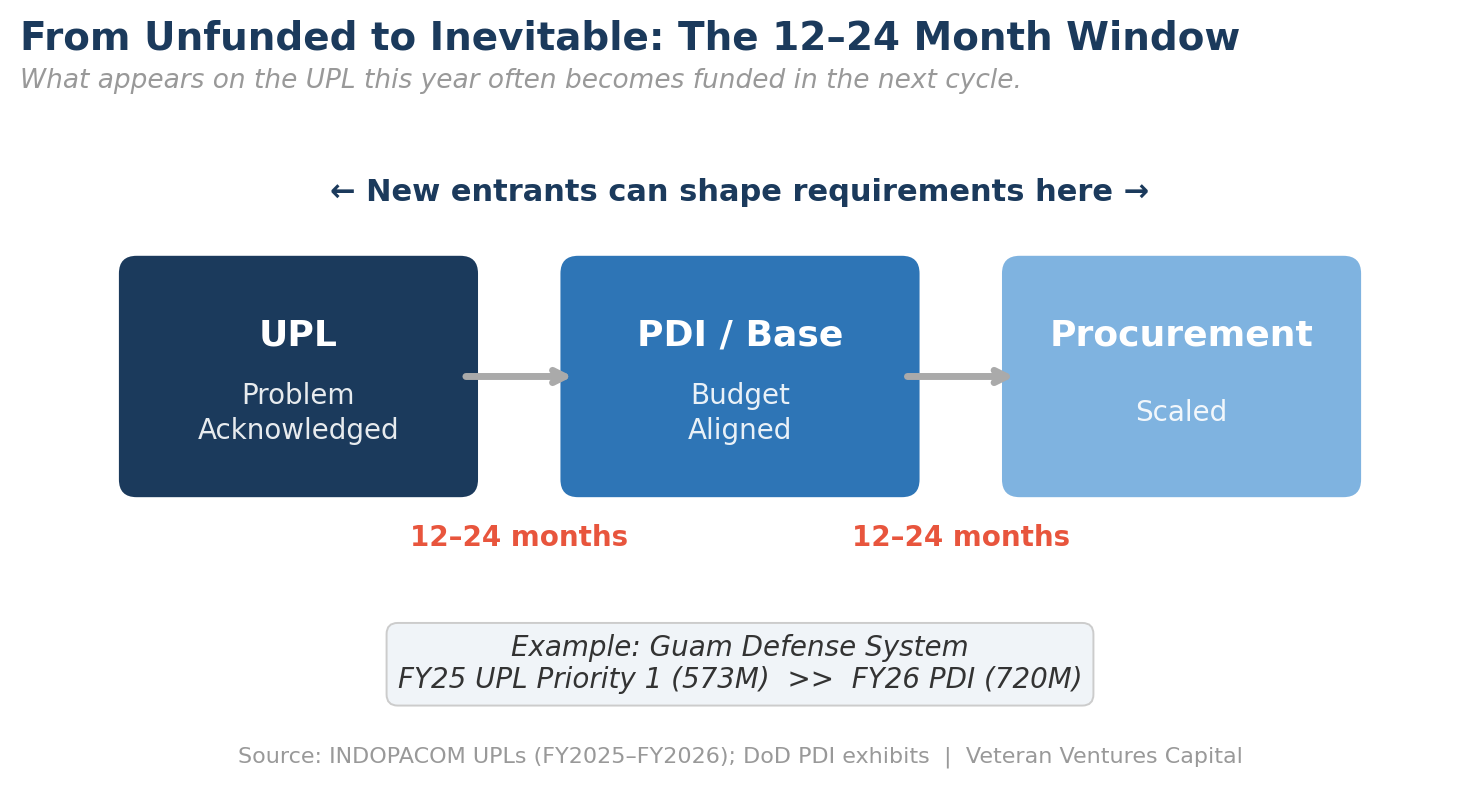 There is typically a 12–24 month window between problem acknowledgment on the UPL, budget alignment in the PDI or base budget, and scaled procurement.That window is where new entrants can still shape requirements and establish position before programs harden and incumbents lock in. The visual below maps this pipeline and the opportunity window it creates.