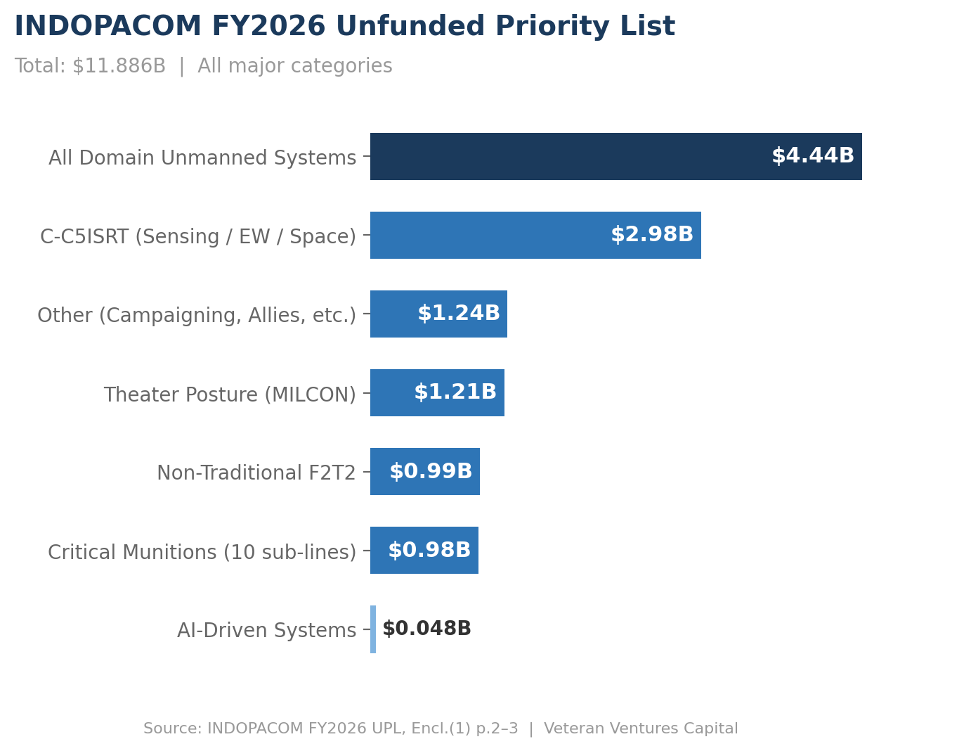 INDOPACOM FY2026 UPL: [Breaking Defense (Jul. 2025)](https://breakingdefense.com/2025/07/a-look-at-the-wish-lists-for-centcom-northcom-southcom-indopacom-and-stratcom/) | [Defense Daily (Jul. 2025)](https://www.defensedaily.com/unmanned-systems-top-indo-pacific-commands-11-9-billion-unfunded-priorities-list/congress/)