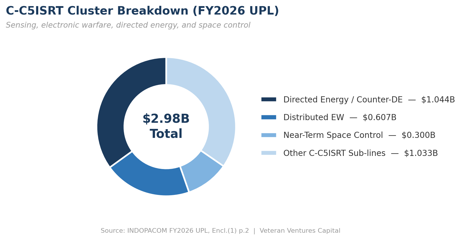 Next is $2.98 billion for the C‑C5ISRT cluster, which includes $1.04 billion in directed energy and counter-directed energy, $607 million in distributed electronic warfare, and $300 million in near-term space control. This is the connective tissue: sensing, networking, and surviving in a denied environment.