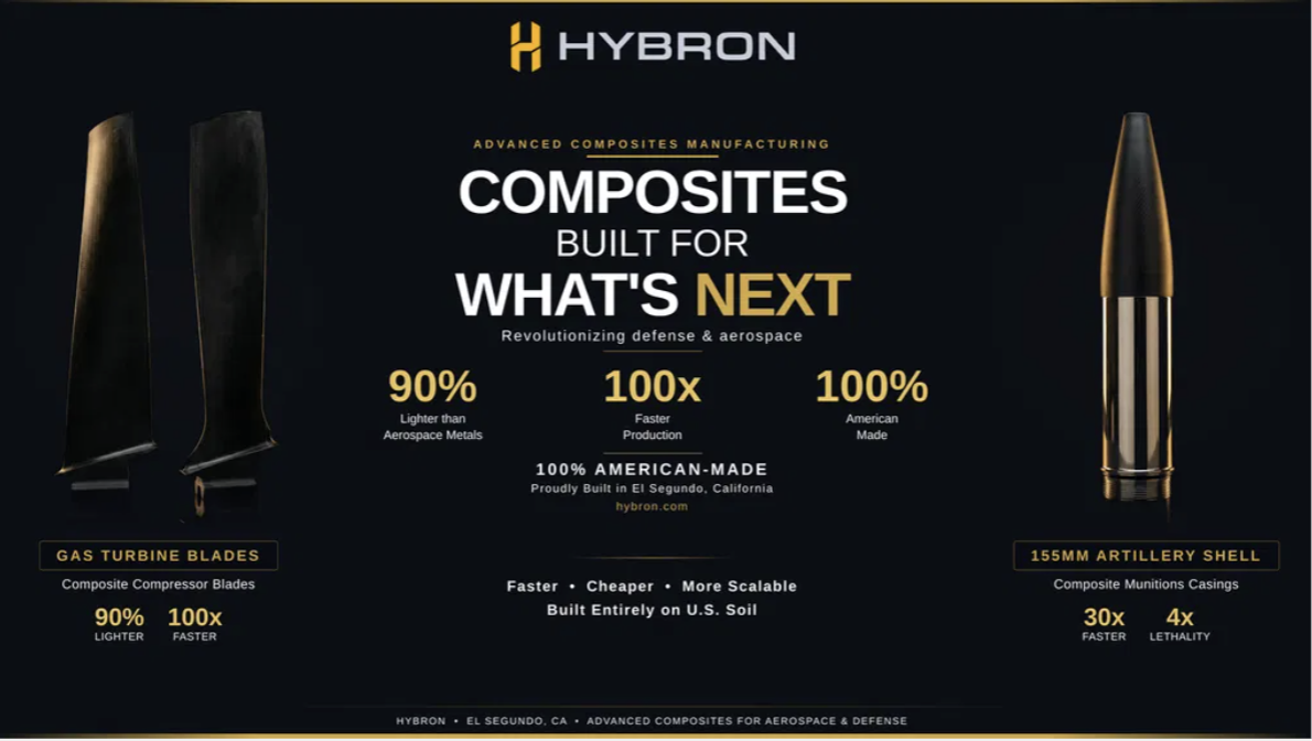 The company's manufacturing approach is designed to support large-scale domestic production of lightweight structural components for aerospace, defense, and industrial applications. Hybron's first products include composite 155mm artillery shell casings and turbine fan blades, both currently in advanced prototyping.